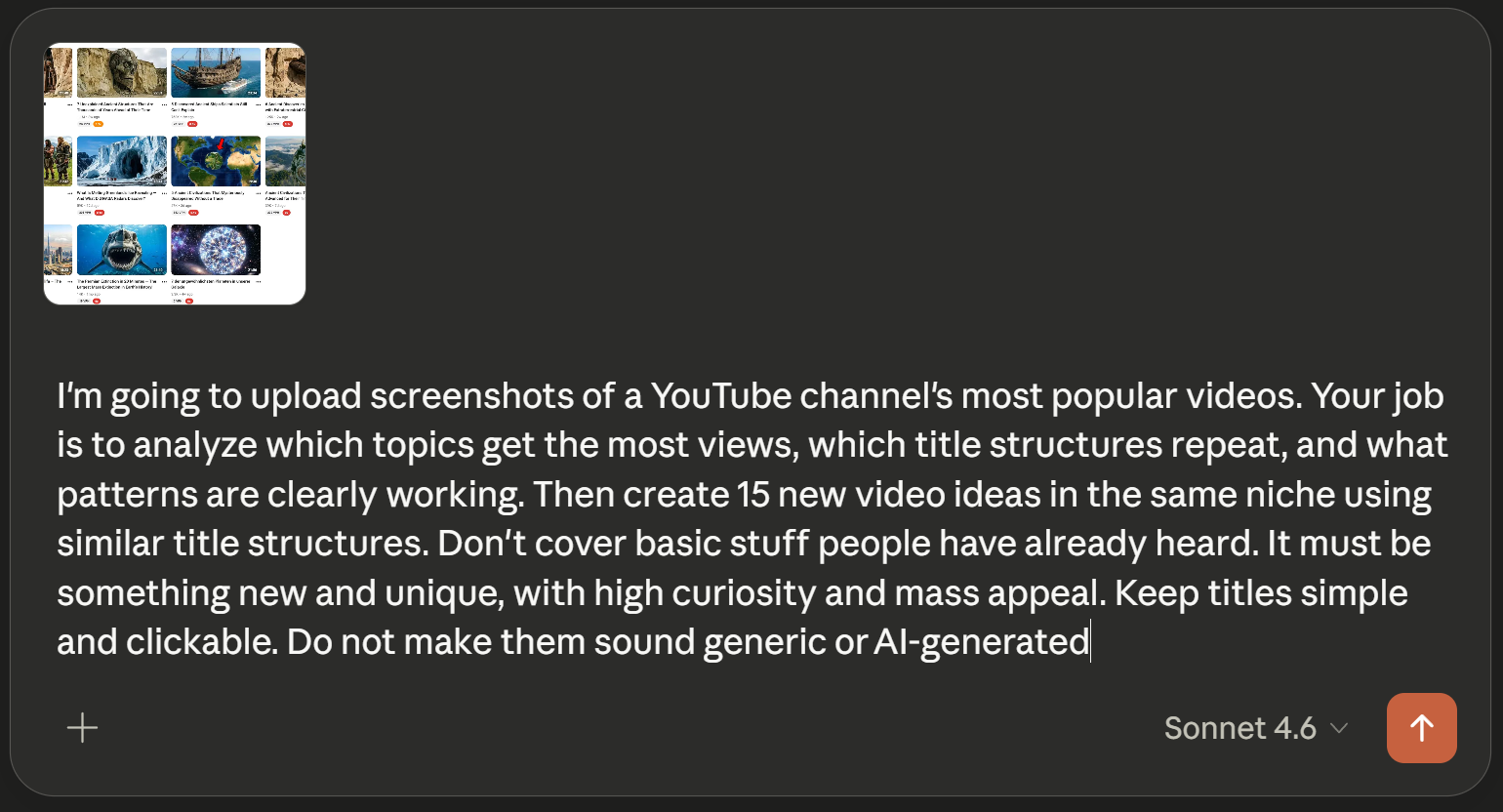 "I'm going to upload screenshots of a YouTube channel's most popular videos. Your job is to analyze which topics get the most views, which title structures repeat, and what patterns are clearly working. Then create 15 new video ideas in the same niche using similar title structures. Don't cover basic stuff people have already heard. It must be something new and unique, with high curiosity and mass appeal. Keep titles simple and clickable. Do not make them sound generic or AI-generated."