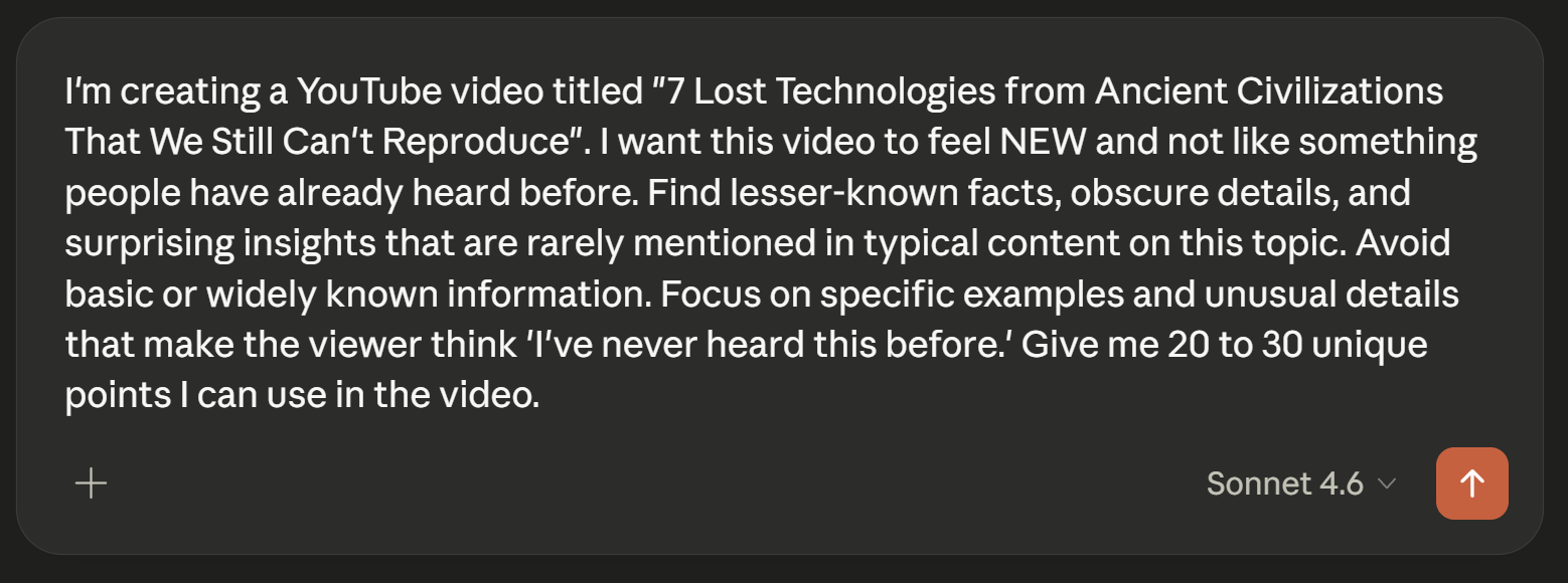 A title like "7 Lost Technologies from Ancient Civilizations That We Still Can't Reproduce" works because it combines a specific number, a surprising premise, and a built-in question the viewer needs answered. That structure is repeatable across hundreds of topics. The AI will find that structure for you and generate a batch of ideas you can immediately use.