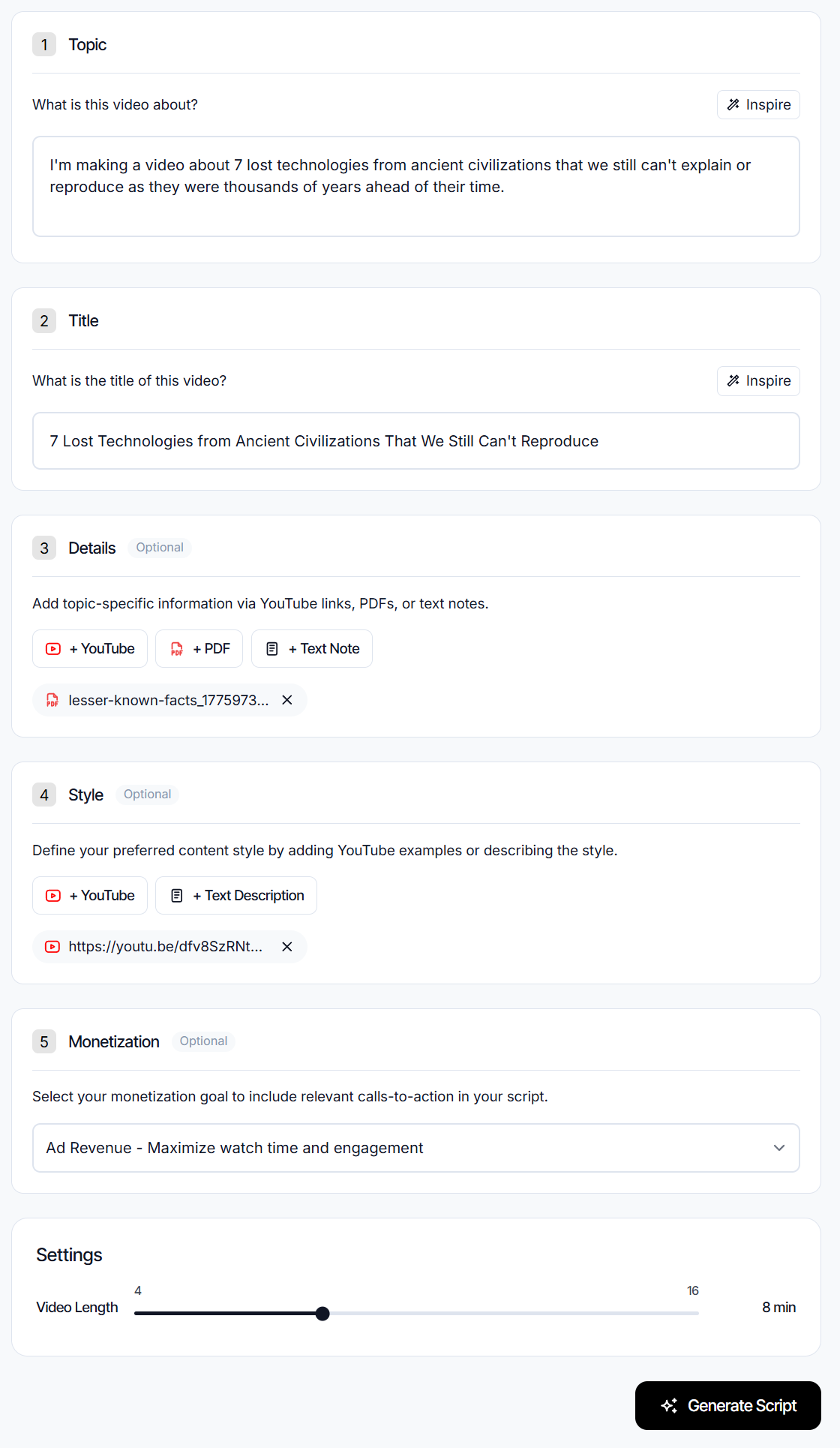 Style: Add a YouTube link to a channel whose style you want to match. This is what makes the output feel human and specific rather than like a template.