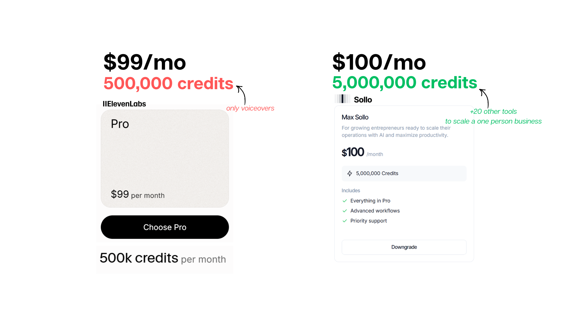 ElevenLabs Pro: $99/month for 500,000 credits Sollo AI Max: $100/month for 5,000,000 credits plus 20 other tools