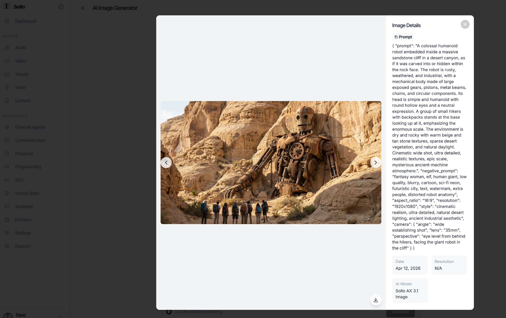 Go to Sollo's Image Generator and write a detailed visual prompt for your thumbnail. Think about what would make someone stop scrolling. For a video about ancient lost technologies, you want something that creates a sense of mystery and scale. Something that looks like it should not exist but clearly does. A human figure for scale works well because it immediately tells the viewer how big and how strange the thing they are about to see is.