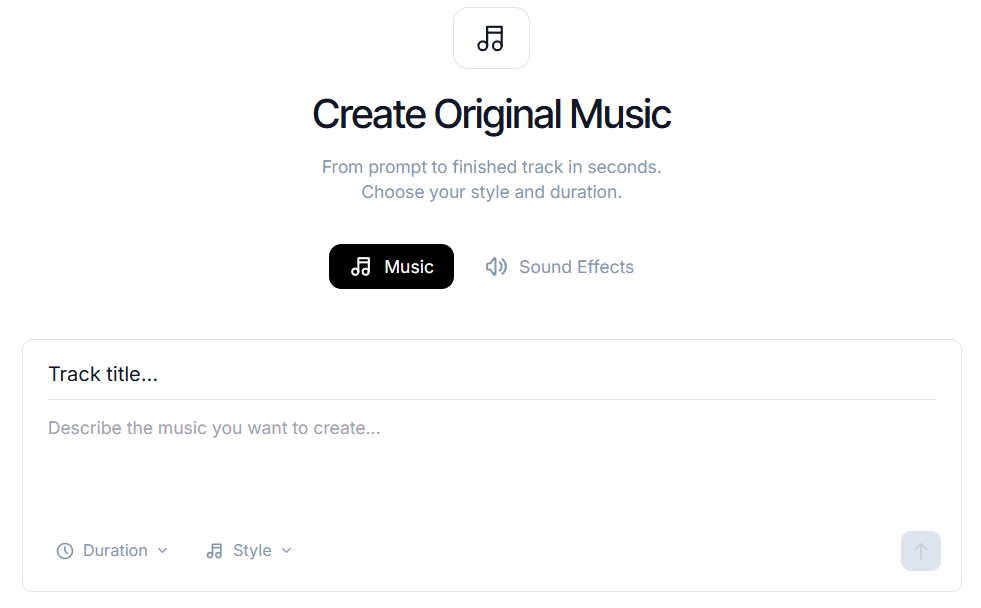 The Audio Studio lets you generate original background music from a simple text prompt. You choose the style (Rock, Lo-Fi, Cinematic, Jazz) and the duration, and the AI composes a fully original track.