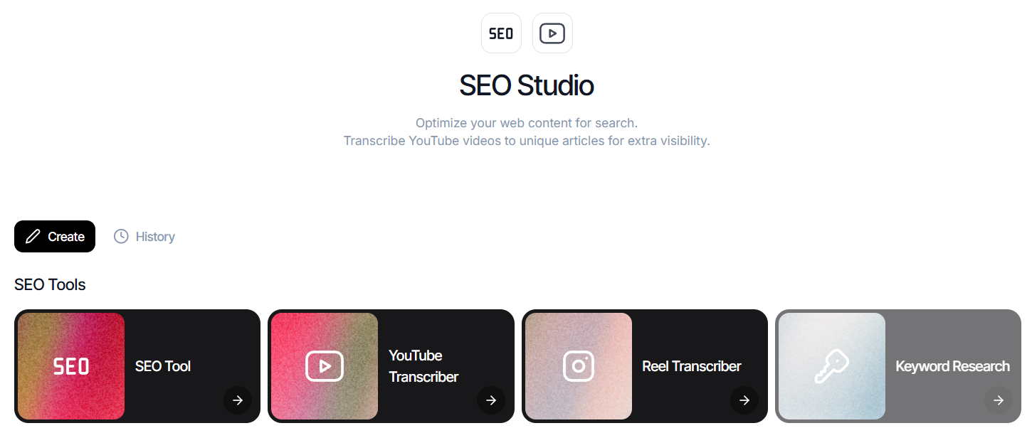 The YouTube Transcriber is a genuine content multiplier. Any video you produce in the Video Studio can be immediately repurposed into a blog post that targets Google and AI search results.