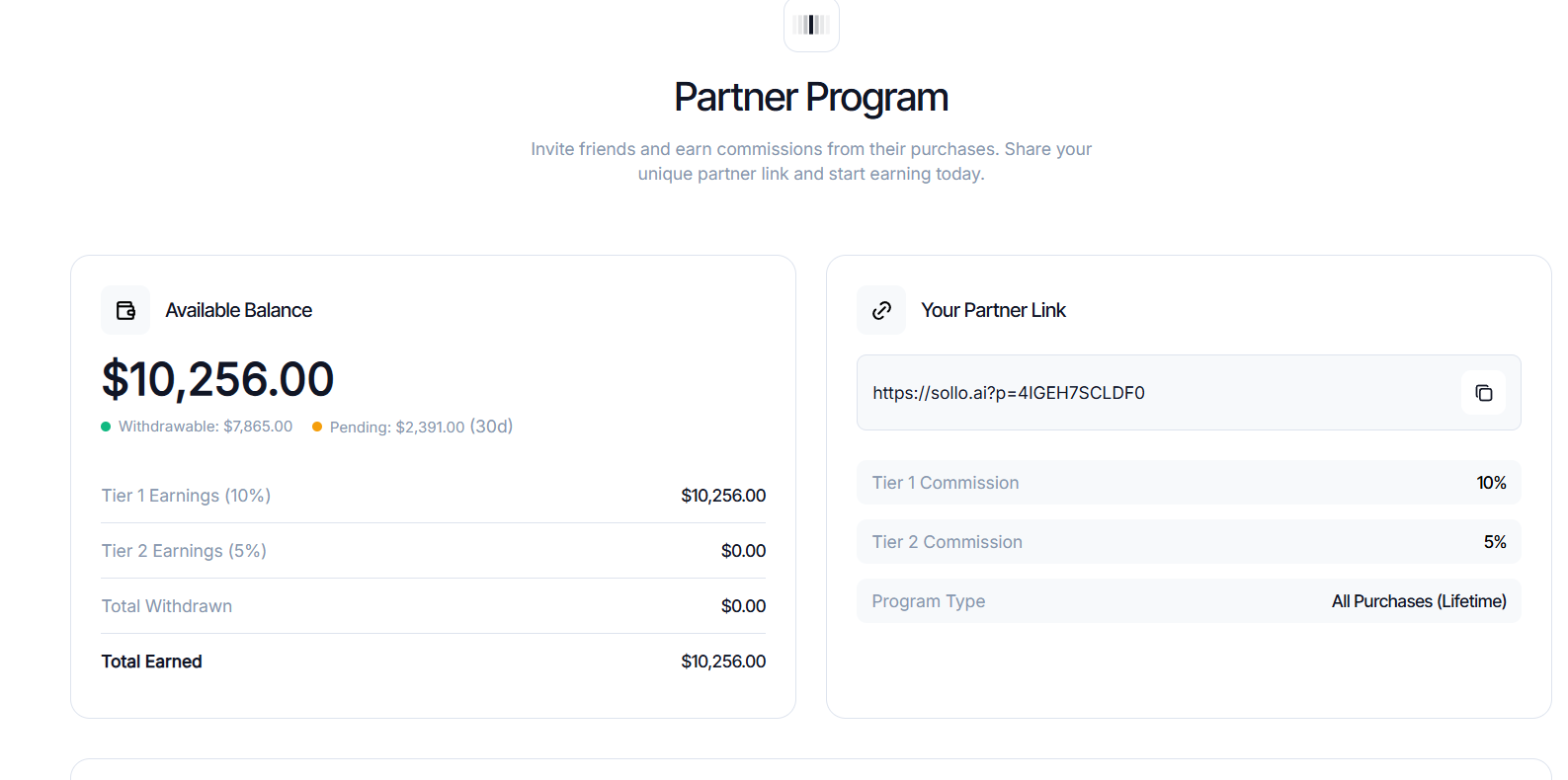 Sollo AI has a built-in two-tier affiliate program:
